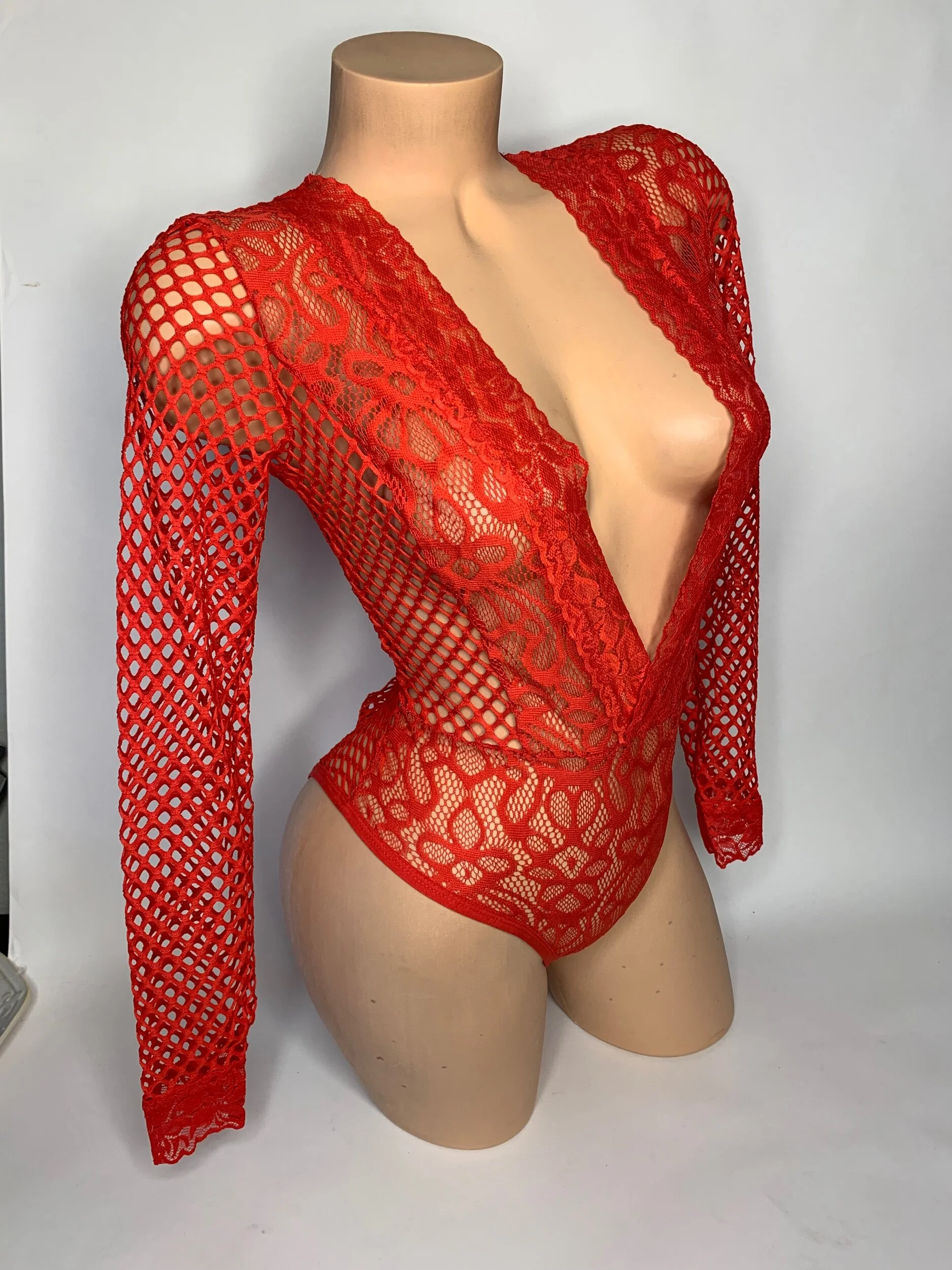 Shop › Red Flower Lace Teddy with Long Fishnet Sleeves and Fishnet Back Image 1 of 3 Image 2 of 3 Image 3 of 3 Red Flower Lace Teddy with Long Fishnet Sleeves and Fishnet Back $20.95 One size fits most. No returns or exchanges. Add To Cart Added! One size fits most. No returns or exchanges.